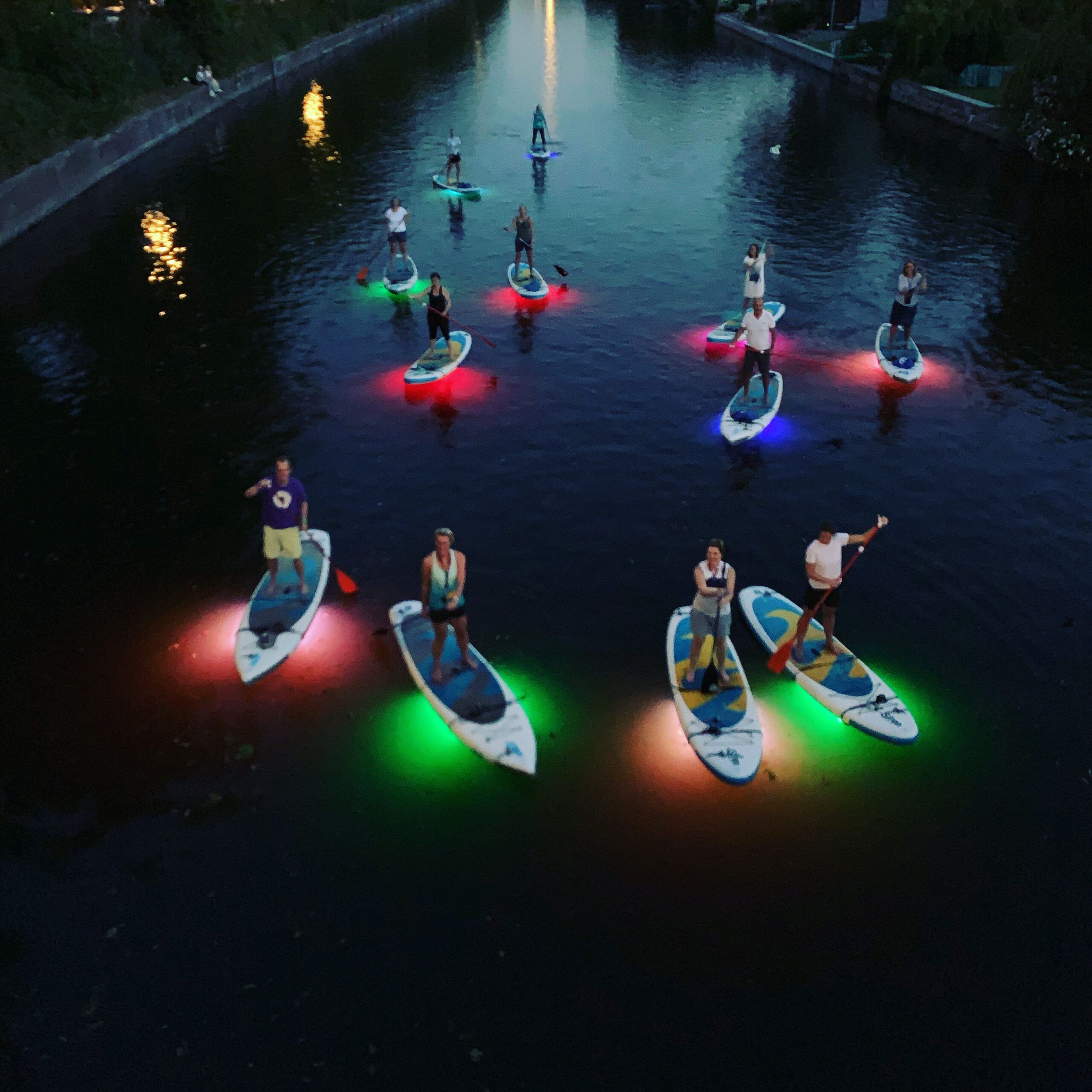 Erlebe die SUP Light Night Tour und entdecke Hamburg mal anders. Wir paddeln entspannt bei Dämmerung übers Wasser auf einem beleuchteten SUP Board.